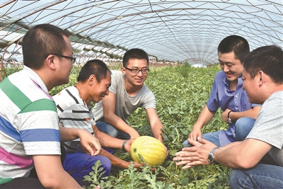 辽宁省本溪县注重对大学生村官的实践锻炼,实行“导师带徒”一对一帮带,助力大学生村官融入农村基层。图为本溪县小市镇谢家崴子村书记助理陈道鹏(中)与导师组一同查看村里特色种植西甜瓜长势情况。