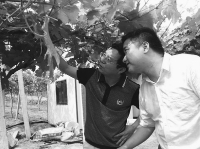 马瑞发(右)和园艺师傅正在探讨葡萄科学管控技术。