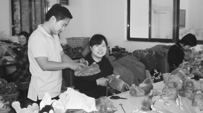 马瑞发(左)在村办工艺玩具厂检查生产情况。