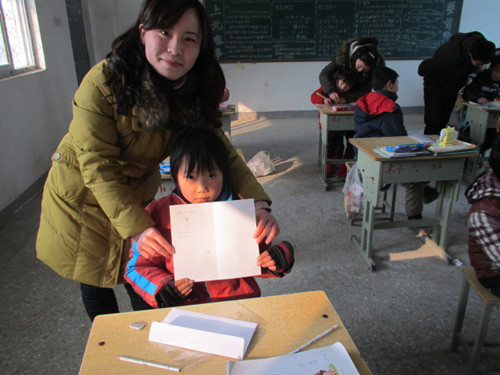 萧县大学生村官切实发挥自身优势,倾情关注农村留守儿童,在工作之余利用小组活动的形式开展结对帮扶活动,定期为留守儿童开展辅导功课、组织才艺表演、跳绳、踢毽子等文体娱乐活动。这次小组活动,村官们组织开展了“感恩父母”寄贺卡活动,留守儿童在村官们的帮助下用贺卡向远在异地打工的父母寄去了思念和节日的祝福,在向父母报平安的同时,也提醒父母回家路上注意安全。安徽萧县圣泉乡袁新庄村书记助理 谷海粟