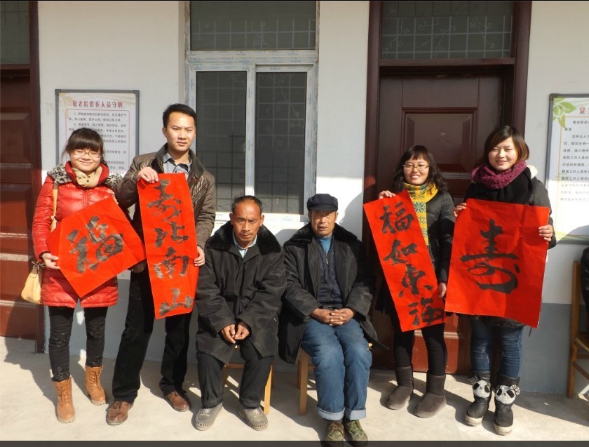 我们把院内的墙角过道扫得干干净净,把老人的衣服被子叠得整整齐齐,永固镇许岗村大学生村官张贺还利用自身特长挥毫泼墨,为老人们写下了“福如东海,寿比南山”的美好祝福,大红的纸映着老人的笑,敬老院内升腾起一片欢乐祥和的氛围。