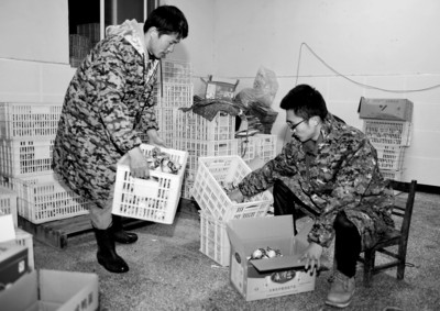 陈刘炜(右)与工人在打包咸鸭蛋发货。