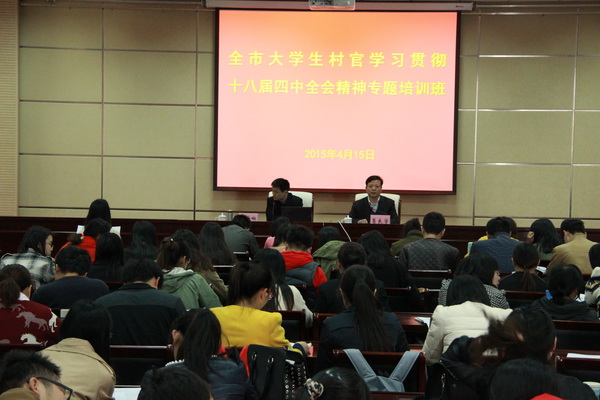 为认真学习深刻领会党的十八届四中全会精神,增强贯彻落实中央、省委市委决策的思想自觉和行动自觉,进一步提升大学生村官的综合素质和能力,4月15日上午,全市大学生村官学习贯彻党的十八届四中全会精神培训班在市委党校举行,来自我市三县三区近150名大学生村官将参加为期两天半的集中培训。