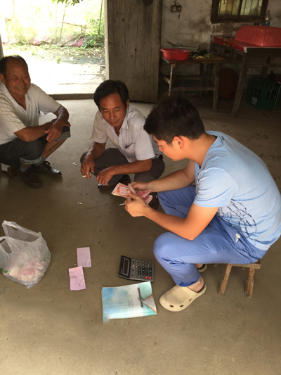 图为大学生村官陈超上门为村中行动不便的老人送去卖粮款