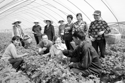 题图:王萌萌姐弟俩在种植大棚里与草莓种植户一起查看草莓长势。