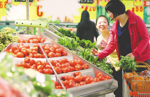 图为北京市延庆县康庄镇小丰营村书记助理谢萌萌(中)在超市了解蔬菜行情。