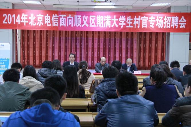 为拓宽合同期满大学生村官流动发展渠道,顺义团区委、区人力社保局与中国电信北京分公司进行接洽,于2014年3月27日下午,在我区人才服务中心三层举行面向期满大学生村官专场招聘会。北京电信人力资源部主任张柏、顺义电信局局长石磊到招聘会现场并讲话。有51名大学生村官参加了本次招聘会。