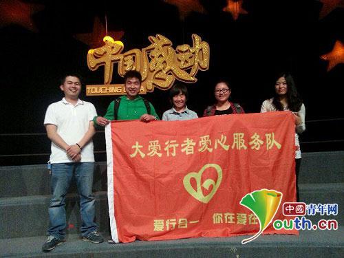 大爱行者爱心服务队参加某电视节目颁奖,任高旗(左一)随身携带队旗,他说要把爱随时随地传播出去。 任高旗 供图