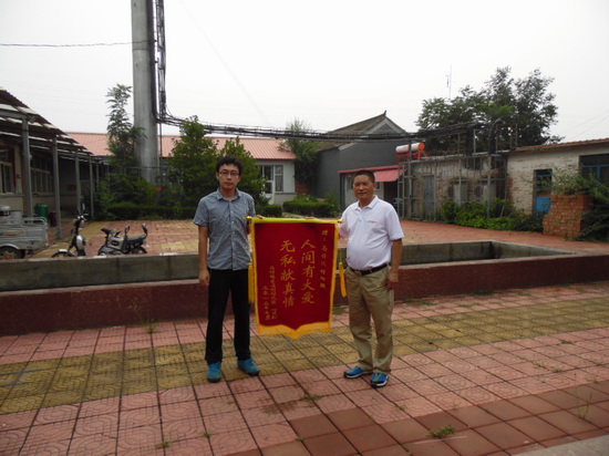 7月28日一大早,北京市平谷区马坊镇东店村党支部书记焦成友来到紧邻的三条街村,将一面写有“人间有大爱,无私献真情”的锦旗送给了该村的大学生村官马腾达。