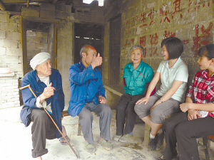 周晓琳(右二)和村里的五保老人、群众交谈。