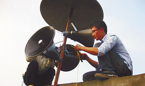 谢文鑫翻墙爬房安装喇叭。