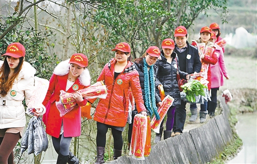 2月3日,巴南区接龙镇桂兴村院坝,大学生村官志愿者带着年货果蔬前往孤老家中。记者 崔力 实习生 谢智强 摄