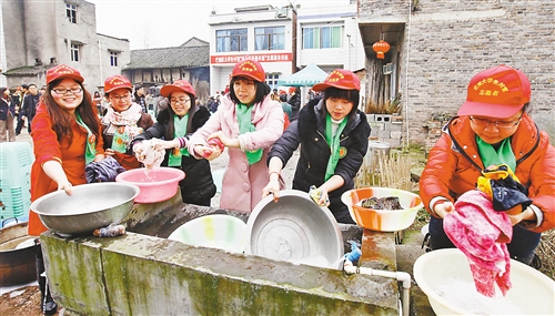 2月3日,巴南区接龙镇桂兴村院坝,大学生村官志愿者替孤老们洗衣服。 记者 崔力 实习生 谢智强 摄