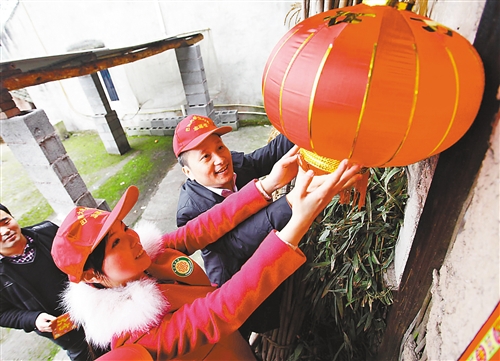 2月3日,巴南区接龙镇桂兴村院坝,志愿者在孤老家门前挂上大红灯笼。 记者 崔力 实习生 谢智强 摄