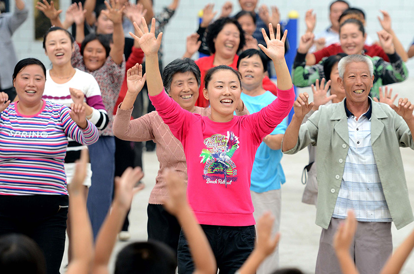 村支书刘祎正在鸭河营村的村民服务中心前的广场上指导村民们跳健身操。