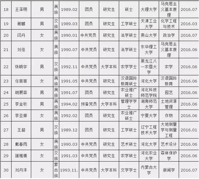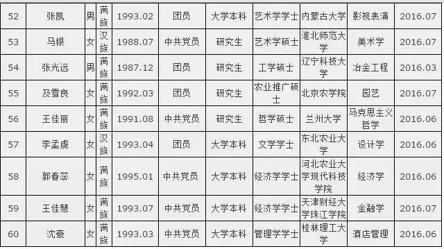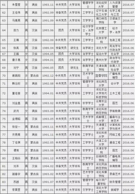按照《河北省2016年大学生村官选聘简章》要求,现将承德市2016年拟录取大学生村官有关情况予以公示,欢迎广大群众监督、反映或举报公示对象违反选聘规定的有关问题。公示2016年选聘大学生村官个人信息需进一步核实的请一并与市委组织部沟通联系。未提交个人档案或党员档案的人员要确保资格审查时填写的相关信息真实准确,如经核查档案后,发现有不符合选聘条件的,将严格按照《河北省2016年大学生村官选聘简章》要求,取消录取资格。公示时间:10月8日—10月14日公示内容:拟选聘人员姓名、性别、出生年月、政治面貌、学历学位、毕业院校及专业和毕业时间等(详见承德市2016年选聘大学生村官拟录取人员公示名单)。