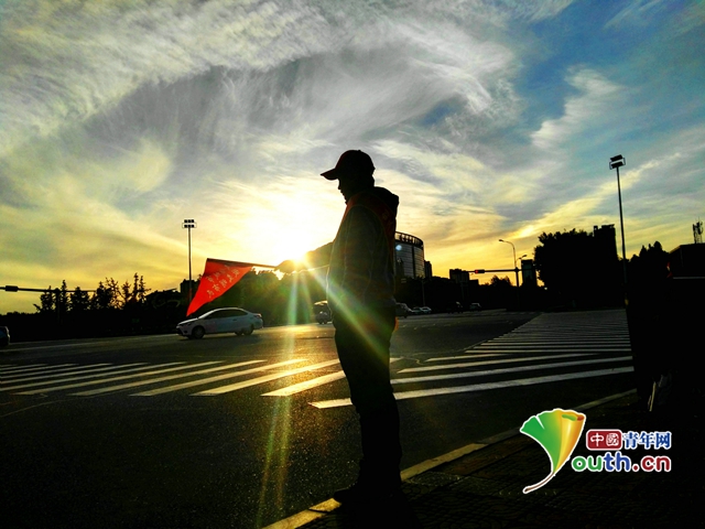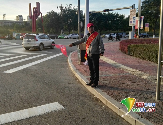 图为大学生村官在路口指挥行人文明出行。