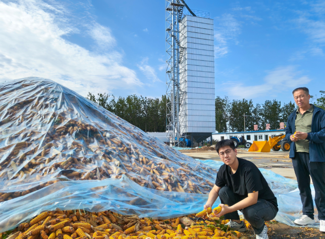 胡桐搏(左)检查玉米籽粒含水情况,为后续烘干和销售做准备。朱宇豪 摄