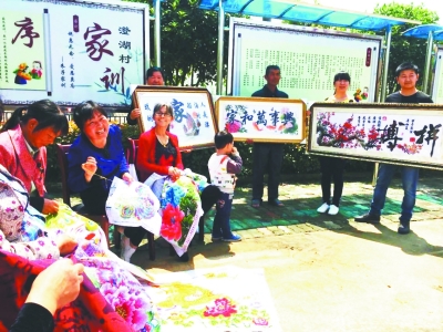 除了动员大学生村官帮助文化程度不高的村民提炼家风家训,黄陂区大潭办事处还开展了一系列丰富多彩的活动来传扬好家风,打造好民风。在村里,巧手妇女,时常聚在一起绣家风(见图)。活动室里,墨香四溢,乐声飘扬,村里的书法爱好者写家风,爱好音乐的村民在这里弹家风,唱家风。