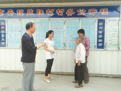 图为周晓露(左二)在向村民征求村务公开建议。