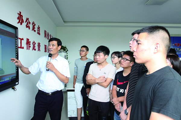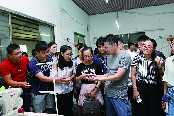 学员们在连云港市赣榆区墩尚镇大学生村官郭长鑫创办的长鑫渔具厂考察。
