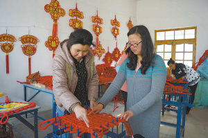 上图为天喜工坊创办人、台儿庄涧头集镇孙楼村书记助理刘佳莹(右)在指导村民制作中国结。 章成伟 丁青 杨涌摄
