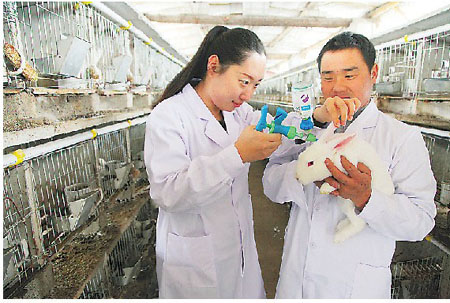 图为枣庄市峄城区榴园镇桃花村副书记、峄城区大学生村官创业联盟主席刘璐(左)在獭兔养殖基地给兔子打防疫针。