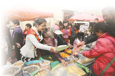 广饶县大学生村官鲍腾飞在集市上发放法律知识宣传单。 侯田田供图