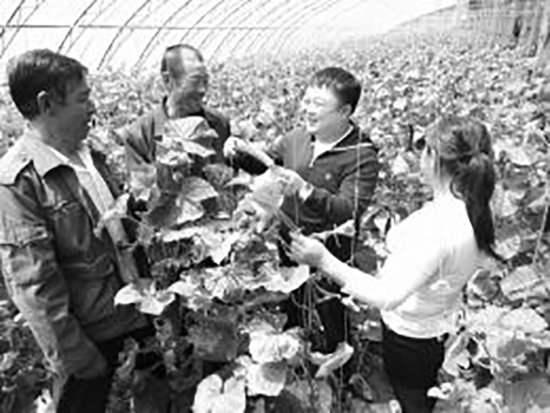 张鹏(右二)在大棚里给农民讲解黄瓜种植技术。 本报记者 杨晓明 摄