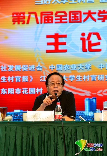 中国村社发展促进会原副会长顾益康用风趣、幽默的语言向大学生村官传授如何做一名合格优秀的村官。中国青年网记者 张楠 摄