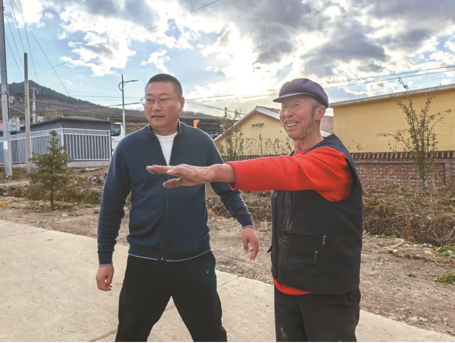 张国刚(左)与村民聊村里的变化。 车婧 摄