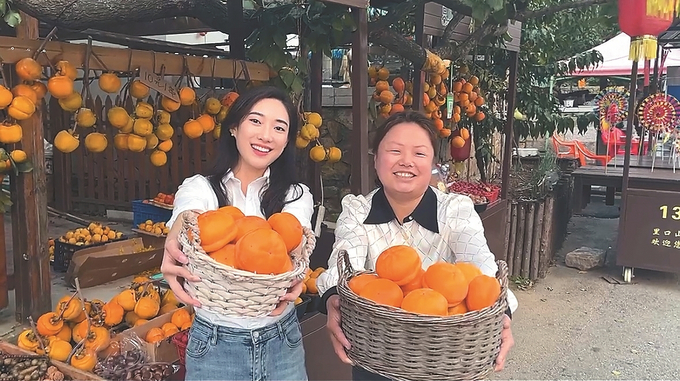 选调生刘琳(左)在推介村里的金秋古柿。 (威海市委组织部供图)