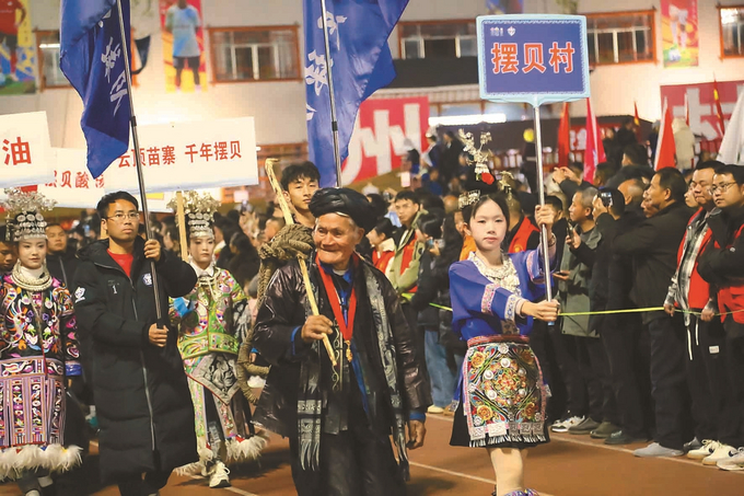 1月4日,在贵州省榕江县“村超村晚·民族团结”2025和美乡村足球超级联赛开幕式上,来自榕江县兴华乡摆贝村的“村超爷爷”杨老赶身穿苗族服饰,肩扛斗牛棕绳,胸前佩戴“光荣在党五十年”勋章,率领摆贝芦笙队缓缓入场,其后身着百鸟衣的苗族姑娘翩翩起舞。当晚,108支“村超”球队及村民拉拉队身着各式特色民族服饰依次入场,一场充满民族味的新春文化盛宴,让游客直呼“太震撼”“不虚此行”。