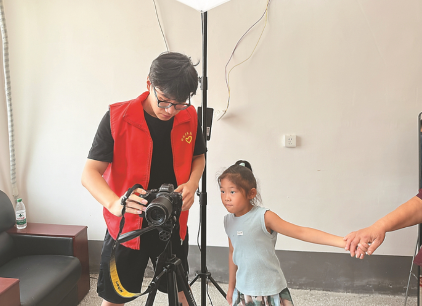 寇桓锦在为孩子拍摄照片。(席黄村村委会供图)
