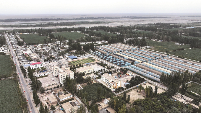 阿热勒村全貌,村后就是塔克拉玛干沙漠。 (阿热勒村村委会供图)
