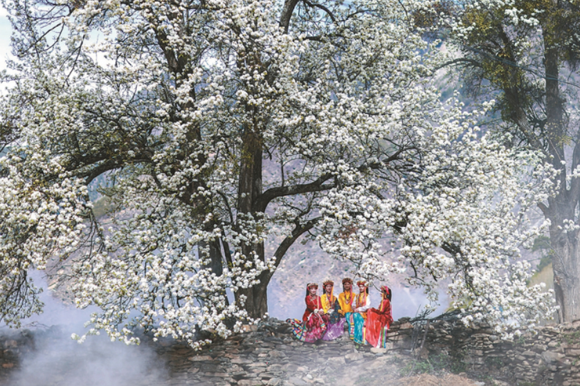 丹巴姑娘身着嘉绒服饰,在梨花树下赏春花。(丹巴县委组织部供图)