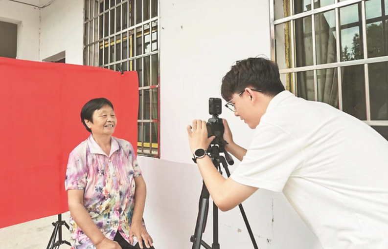 曹鹏(右)在村为老人拍摄照片。 (畔山村村委会供图)