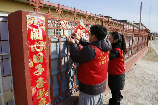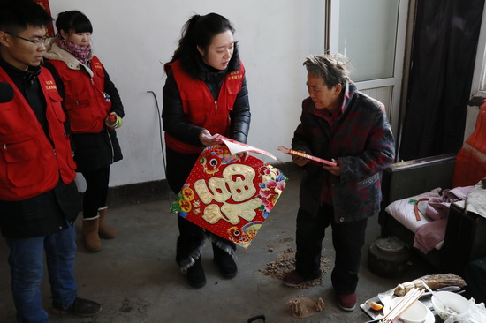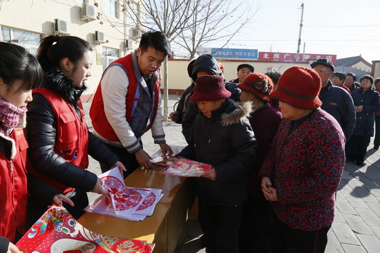 2015年2月12日,在春节即将到来之际,北房镇红伞房志愿服务站在站长周正的带领下来到北房村,免费为这里60岁以上的老人发放春联、福字、窗花。队员们按照事先的分工,有的维护现场秩序,有的负责发放年货。现场气氛热烈,队员将这些春联、福字一一送到老人们的手中,看着老人们一个个高兴的拿着这些喜庆的年货,一声声“谢谢孩子们”让在场队员们都倍感欣慰。本次迎新年主题活动发放春联、福字、窗花共计400多幅。