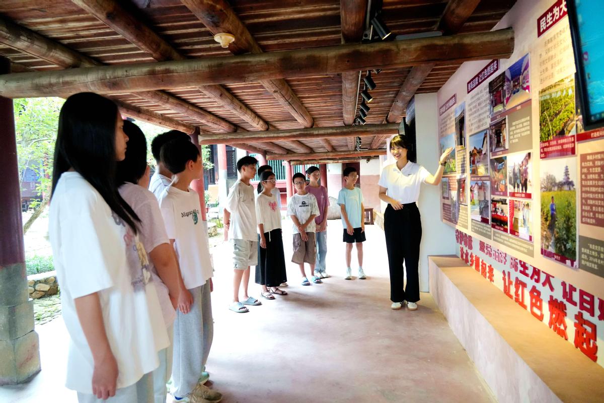 王璐(右一)在为中小学生讲述西陂村的红色文化和传统文化故事。 卢达龙 摄