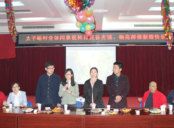 这两位新娘就是太子峪村的大学生村官助理谷光璞和郝倩。她们俩分别于2013年、2014年研究生毕业后来到太子峪村担任村官助理。新娘谷光璞和新郎韩自亮是认识11年的高中同学,他们老家都在河北省。谷光璞感动地说:“没想到自己的婚礼会以这种形式举办,在这里工作,各位领导同事都对我这么好,就像娘家人一样!”